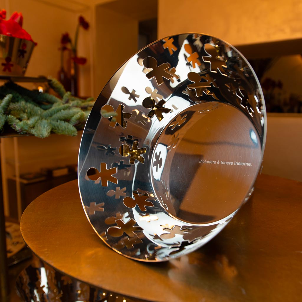“Spreading words to promote facts”: these are the words ofAntonio Giuseppe Malafarina, sole director of Diwergo, who haschosen the products of Alessi’s ‘Girotondo’ (ring a ring o’roses)family, designed by Stefano Giovannoni and Guido Venturini, topromote messages of inclusiveness and affordability that will belaser engraved on the trays, baskets and jars of the collection.«When you think of inclusiveness you think of an act of sharing andjoy. How can we not, then, think of ring a ring-o’roses, a ritual thatwe repeated so many times as children, holding hands, then fallingto the ground and then getting back up all together.»