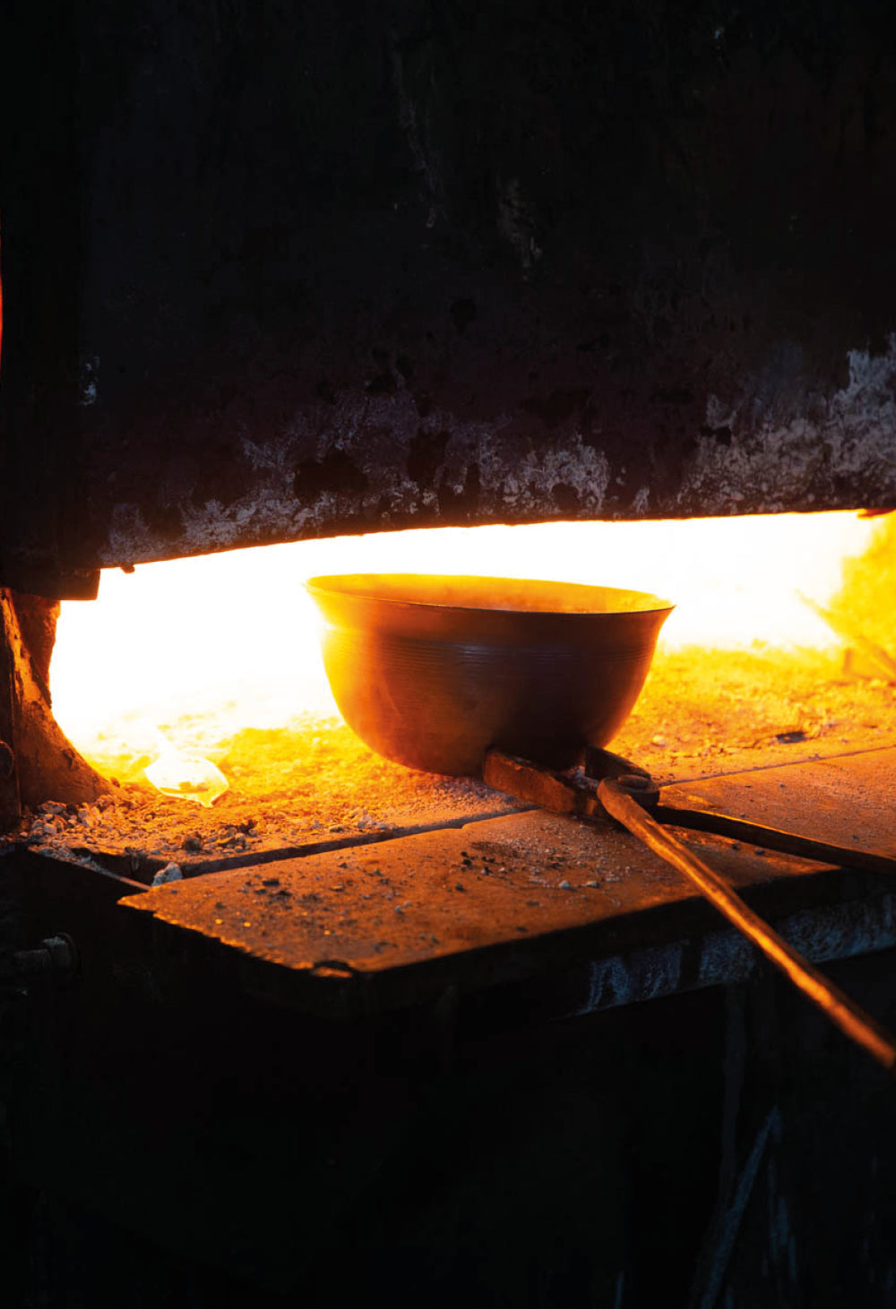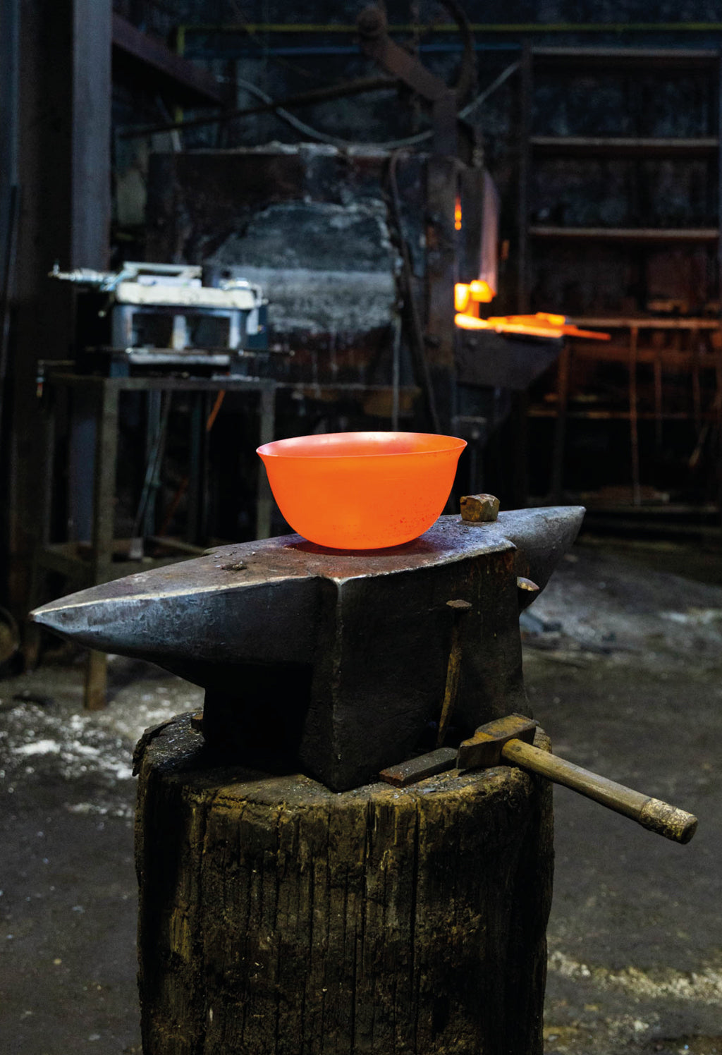 To create it, Iacchetti was inspired by a helmet turned upside down towards the sky, thus giving the artifact a strong expressive charge. The author subverts the meaning of a war symbol, transforming it into a gentle artifact. “It is an archetypal project par excellence, a shapeless form that does not deny all the efforts of the designers throughout history, but lives on its own.” Alberto Alessi commented.Handcrafted on the lathe, the cup is then passed through fire to become incandescent and absorb beeswax that protects it from rust, a traditional and ecological practice typical of the artisans of the Valley.
