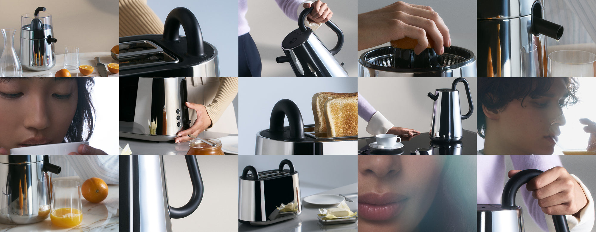 In Japanese, “toru” means “through.” This is why the term was chosen as the name of the new series conceived by Nendo for Alessi: the handles of the objects seem to pass through the main body that composes them, curving elegantly to trace an ideal single line that penetrates the steel volume and re-emerges as if continuing into the spout or a second handle. The functional need thus transforms into a refined and original design.The collection includes an electric kettle, a toaster, and a citrus juicer. The profile of each object is minimal and clean.