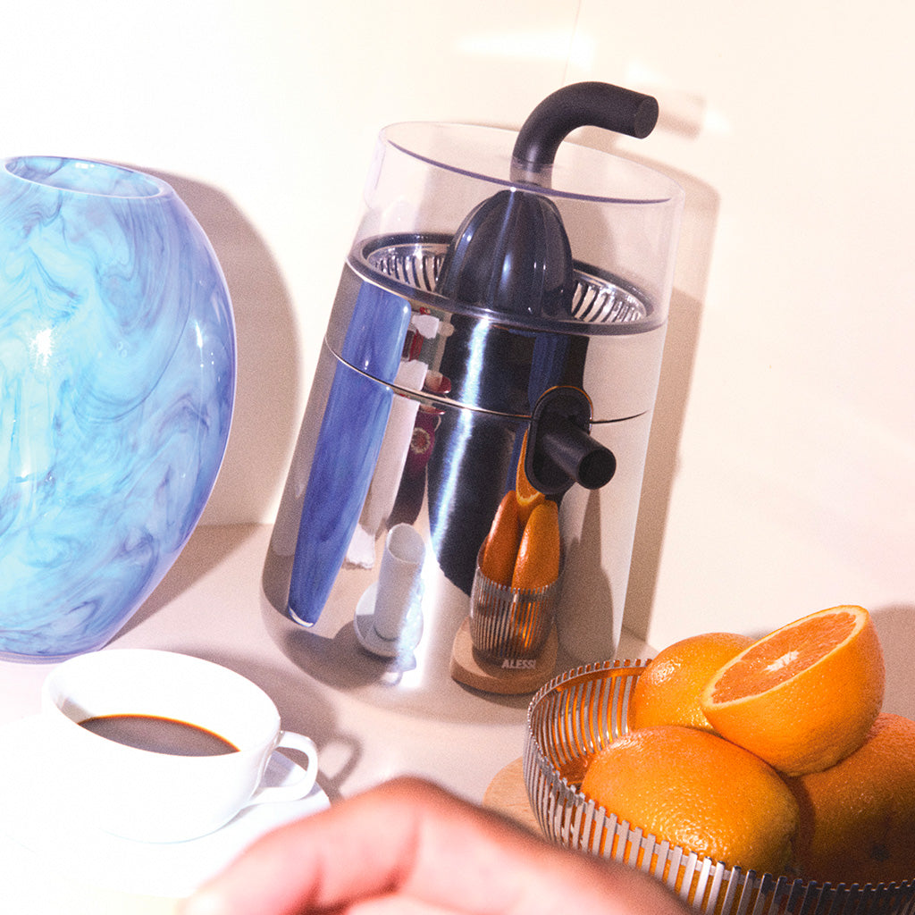 "Utilizing Alessi's exceptional metalworking techniques, which have always been the heart of the company, the stainless steel electric kettle has a simple pitcher shape. The handle protruding from the top appears to pass through the side of the body to the spout," explains Nendo. "Usually, the handle of a kettle is gripped laterally, but the suspended high handle shape of Toru allows this kettle to be easily lifted by holding the top of the handle."The juicer consists of two volumes with a deliberately minimal design: a stainless steel body topped by a transparent dome. The profile line disappears under the base, giving the illusion of a slightly suspended shape: a detail that enriches the overall experience of the object.