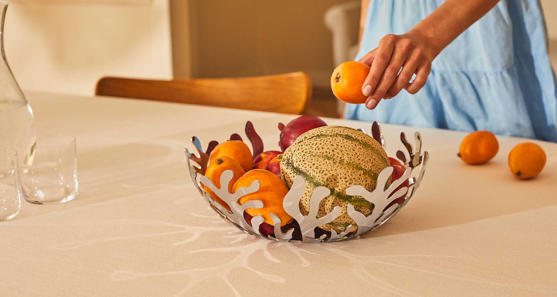 The Mediterraneo decor was born in 2004 during Lightness of Steel, a design workshop curated for Alessi by Laura Polinoro (LPWK). Participants were asked to reinterpret steel in objects that did not communicate physical solidity, and to draw on imagery related to the biological, organic and natural world, which has always been a powerful evocative force when used in objects. Sheet metal fretwork emerged as an ideal way to infuse steel with lightness. Emma Silvestris responded to this challenge with a bold oxymoron, transferring to metal the delicateness of organic coral.